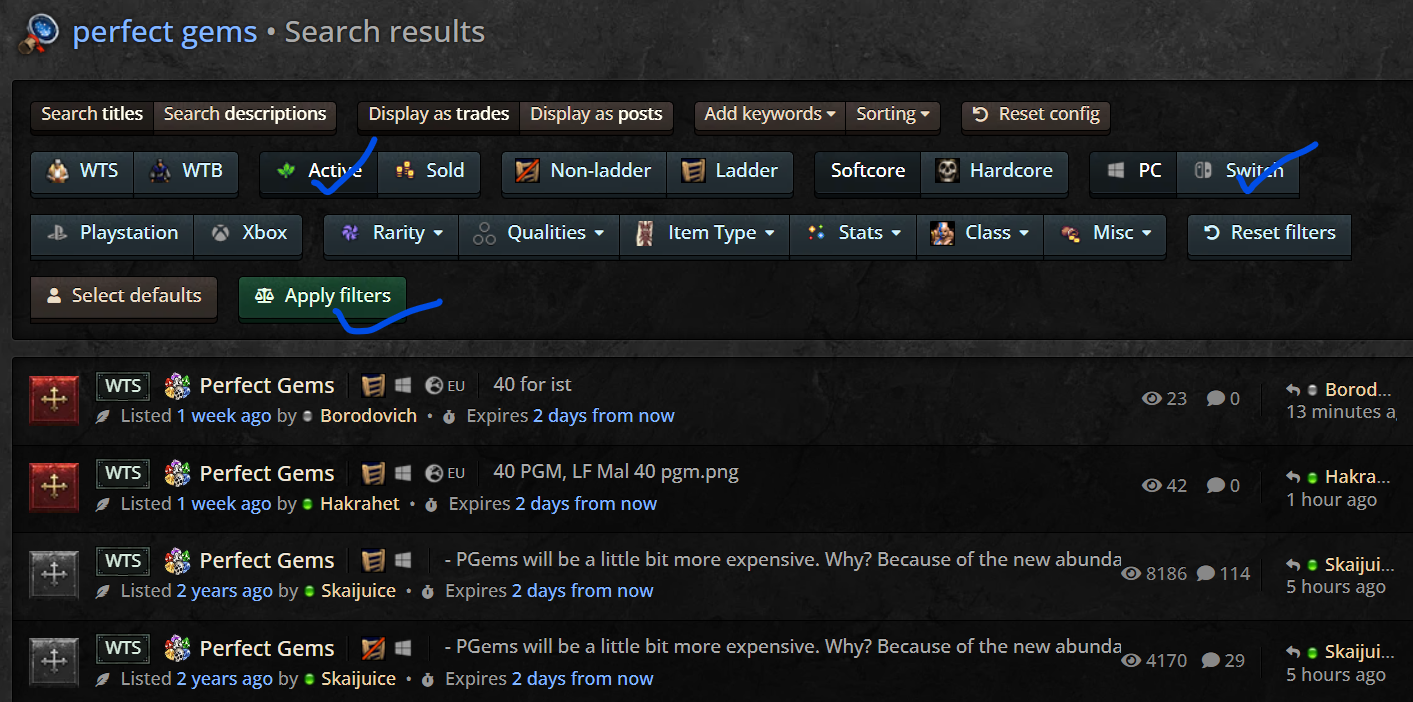 Since you are asking about pgems, they are an unrefuted trading resource well into the end game. As an example below both my threads garnered > 12K views and i re-use the thread since S1 up to the current S7 on PC so as to not clutter the forum. I've sold thousands and use countless QTY's on my TZ charms just for the chance at a 45 Lifer.