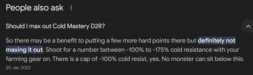 so from the other side - non immune mob - is it true, that -200% is max, as the game mechanics limit?uuee wrote: 1 year agoBack then, -before sunders- the above answer were right. Now, that Cold Mastery works at 20% efficiency against sundered monsters, it should be maxed (as long as you dont have other important skills and such).