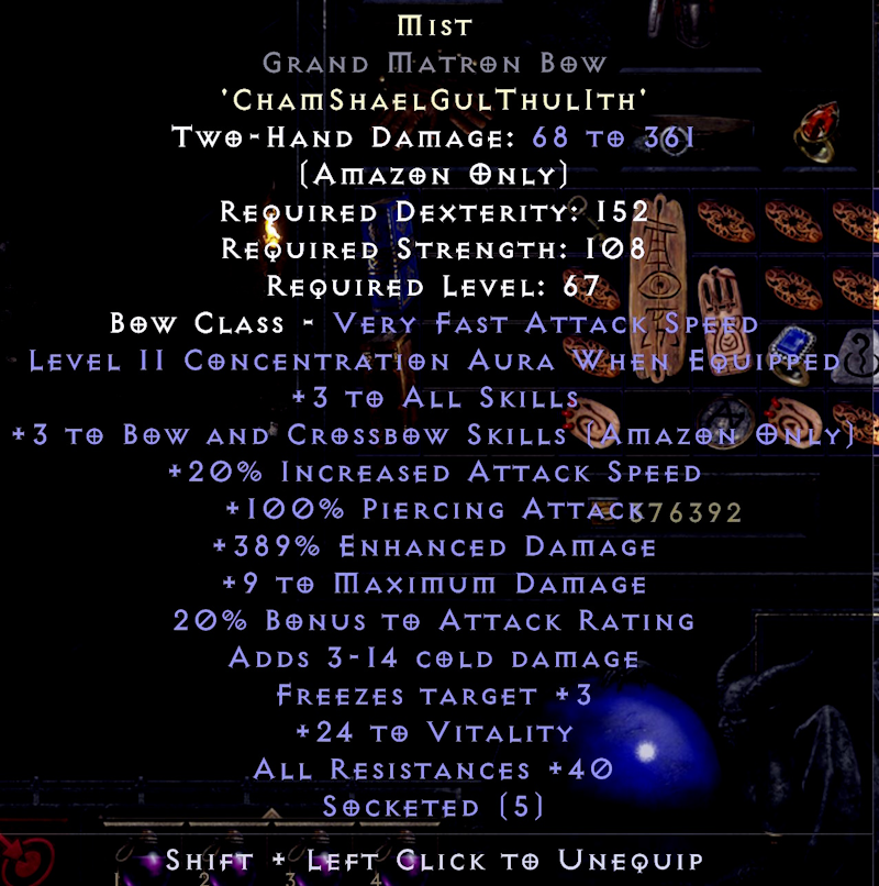 Having a bit of free time and feeling a little bored I got to thinking about what I might be able to do with my Ladder 2 Mist Bow. So I figured why not do a couple of runs just for the hell of it, and then go Stygian Doll hunting in the Durance, because as you know nothing makes more sense than hunting Stygian Dolls in the Durance with a strafezon. I swapped my crafted 20 IAS mits for Dracs and my Highlord’s for Atma’s.