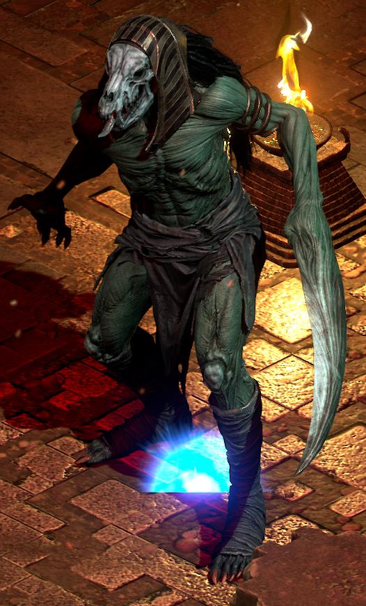 Achmel the Cursed is a Poison Enchanted Superunique Unraveler summoned by Baal in "Wave 2" at the Throne of Destruction. He is accompanied by three minions in Normal, four in Nightmare and five in Hell, where they are all Immune to Magic (100%). It is always Immune to Poison (125%) in all difficulty levels.