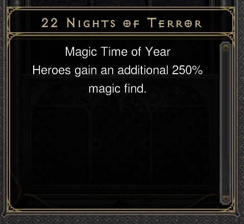 mockingbirdreal wrote: 1 year agoFriday the 13th, all character become Hardcore for 1 dayTh3ory wrote: 1 year agoI didn't realize it until now, but seeing as December 13th is a Friday, we are should expect 22 Nights of Terror to kick off with Black Friday Sales aka NPC vendor prices are 50% off!![]()