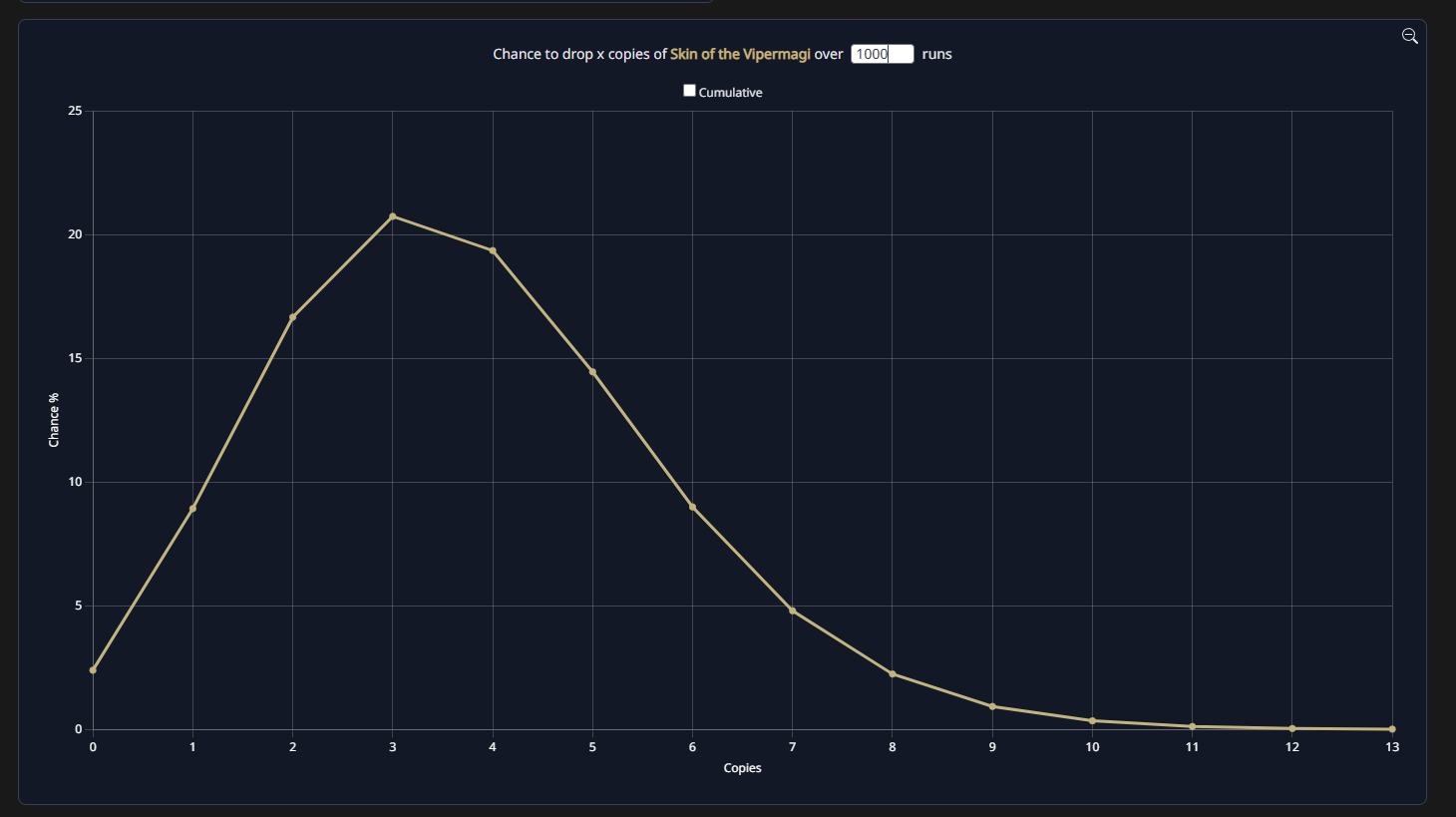 100% agree, that averages are what they are - a simulation of chance vs. compounding; I didn't say this above. 1:13 is very much 1:13 individually per game, not 14% in run 2, or 21% in run 3. However, against the bell-curve it becomes important as there is a likelihood of acquiring multiple copies better than the simulation would suggest.