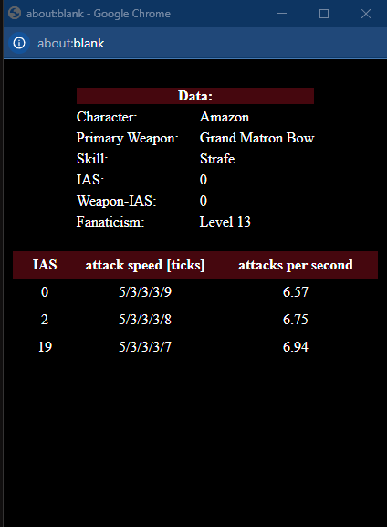 No, it is outdated data for LoD. They've fixed 2fpa Strafe on server side in D2R. Use warren IAS calc.Johny82PL wrote: 1 year agoimage.pnguuee wrote: 1 year agoGrand Matron Bow with lvl15 fana needs 50ias for the fastest possible Strafe ( 4+(2)+6 ), and 46ias for 8fpa multi\ga. 20ias on the gloves would free up your Belt slot for Razortail (to hit 100% Pierce).Johny82PL wrote: 1 year agoOk, maybe I list my gear:
