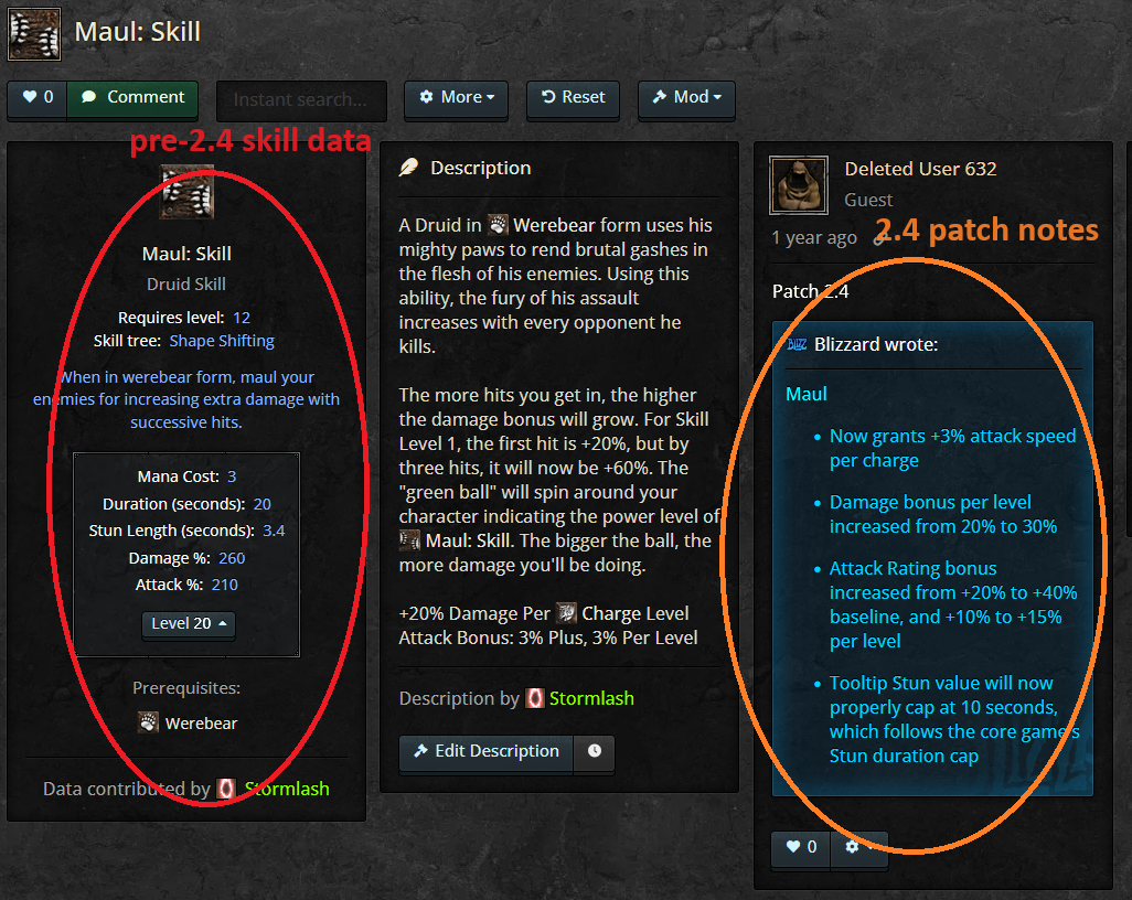 There are several skills that don't have their updated values post patch 2.4. For example, let's take " Maul" (the skill). It has a comment below that says how the values have changed (ar, damage, ias), but it isn't incorporated in the calculations when you want to see the skill at level "x". This is the case with several skills and I think it'd be great to update them. So: