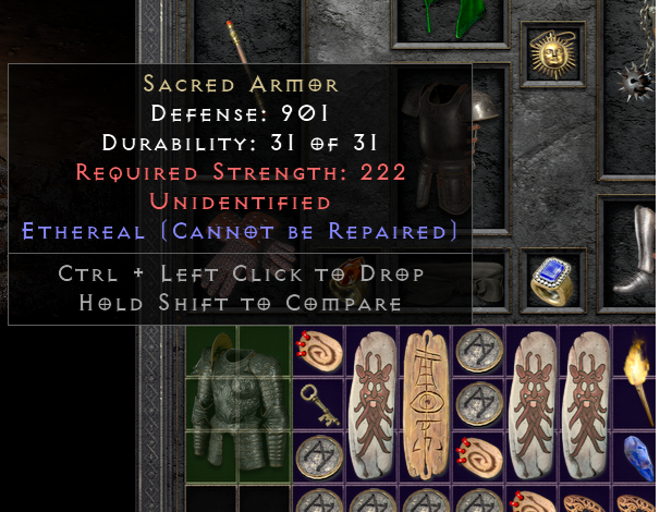 It can be Templar's Might (green) or Tyrael's Might (blue). The blue one is the rarest unique in the whole game. More rare than Tyrael's Might is an ethereal Tyrael's Might. This unidentified Sacred Armor could be one. Curious what it is.Flyhorse wrote: 11 months agoWhy blue one? What so special about it? Or you mean a white one?moot11 wrote: 11 months agoI mean, it's very rare, but god damn it! I just want to find a blue one!