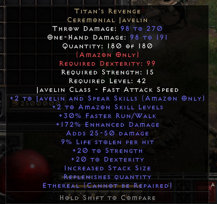Could be, but is too early to tell. Breath of the Dying needs a Vex rune also, I have other priorities for it. Also I didin't find a 6 socket ethereal Berserker Axe yet. In the way I can find an ethereal item that has an excelent potential to worth high runes, such as griffon eye.ghostpos wrote: 9 months agoWhat you going to slot that bad boy in? Breath of the Dying? @Alexandre_Souza