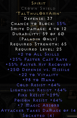 Spent some time farming The Countess on Nightmare for some runes, so I could make a Spirit shield. I had two 0os Paladin shield candidates (a Heraldic Shield and a Crown Shield, both around 30 res) that I rolled sockets in with the cube (been trying to preserve my socket quest from normal). Got 4os with the 2nd one (the Crown Shield):