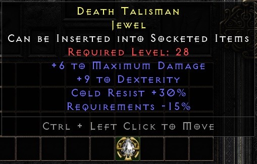Close call for a GG Low Level Dueling jewel. Perfect roll on cold res and dex with -15% req. Max Dmg is 3 off perfect. Can't imagine how much it would be worth with +20% ED or 6 strength (max below lvl30)