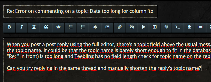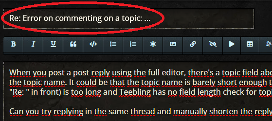 When you post a post reply using the full editor, there's a topic field above the usual message field, which is pre-filled with "Re: " + the topic name. It could be that the topic name is barely short enough to fit in the database field, but the reply topic name (with the "Re: " in front) is too long and Teebling has no field length check for topic name on the reply form submission?