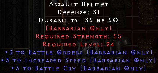 +3 Battle Orders, +3 Increased Speed, and +3 Battle Cry, so it's a max roll on some decent skills. Make me an offer, and let me know if you want me to include socketing for you as well.