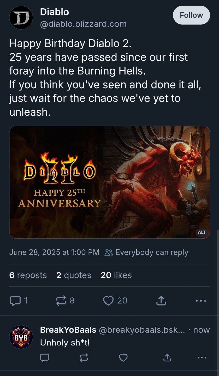 I hope, if they do any major changes, that it's just like a new end game boss or event, or something like that. D2 has had 4 acts and an expansion for so long, I don't know how I'd feel about act 6. They'd probably end up sending us to heaven or something, maybe follow what happened to Tyrael post D2 pre D3.