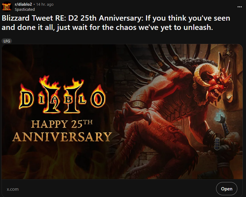 I think there's only so much before tapping and retapping can do.mhlg wrote: 6 months agoI think we do it by tapping into our memories to resurrect ourselves, and then we breath new life into Diablo 2 and Blizzard is the beneficiary.Skaijuice wrote: 7 months agoVery much so...much of that motivation is depleted or gone.Semirotta wrote: 7 months agoTbh, I dont personally care. D2r is dead in my eyes and I just hop in once in a while to play. Nothing could make me return to it as deeply as I was back in the day.