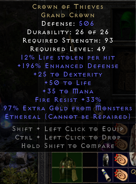 Got the ethereal 12 LL Crown of Thieves in a TZ Great Marsh while leveling my new summon necromancer. I found the Lo from a Skeleton in Lower Kurast.