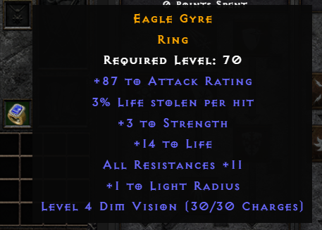 Crafted Blood Ring 87 ar 3 ll 3 str 14 life 11@ 1 light radius 30 charges Dim Vision 4 | L70