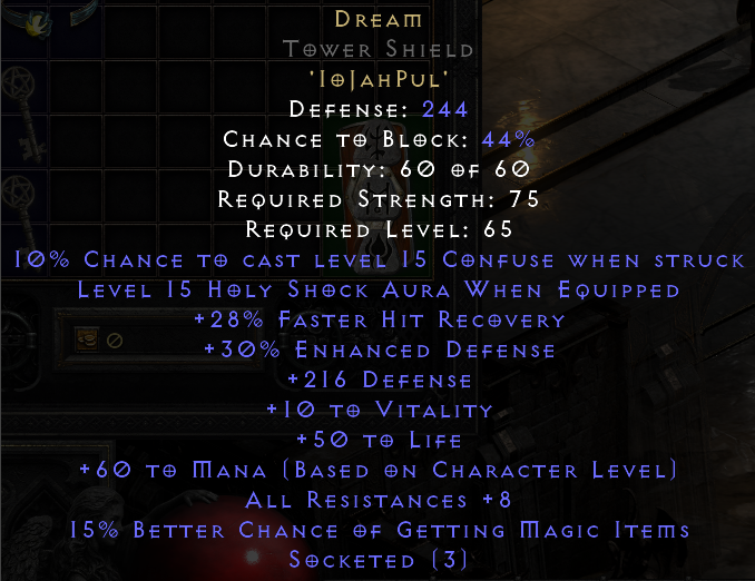 I decided to use my two Jah runes for a dual Dream Enchant Zeal sorceress. I haven't played one in many years. The Diadem came out decent. The shield meh. Ah well. I can't wait to try them out.