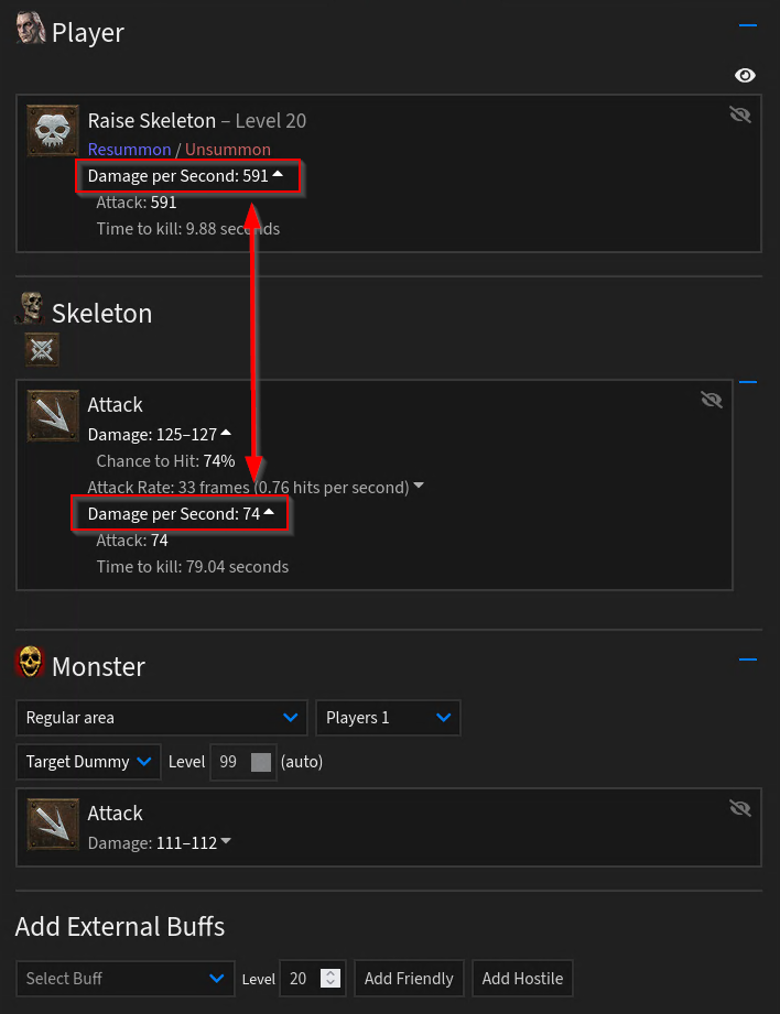 The first one shows you a theoretical total from all 8 skeletons combined (level 20 Raise Skeletons allow you to have 8 skeletons at once). The second is for one skeleton.