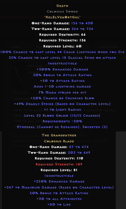 The highest possible damage on grandfather (perfect roll, lvl99 character) does less damage than the worst possible roll on Death (300 ED) in an Eth Colossus Sword. On top of that, Death has everything you want in a weapon except IAS