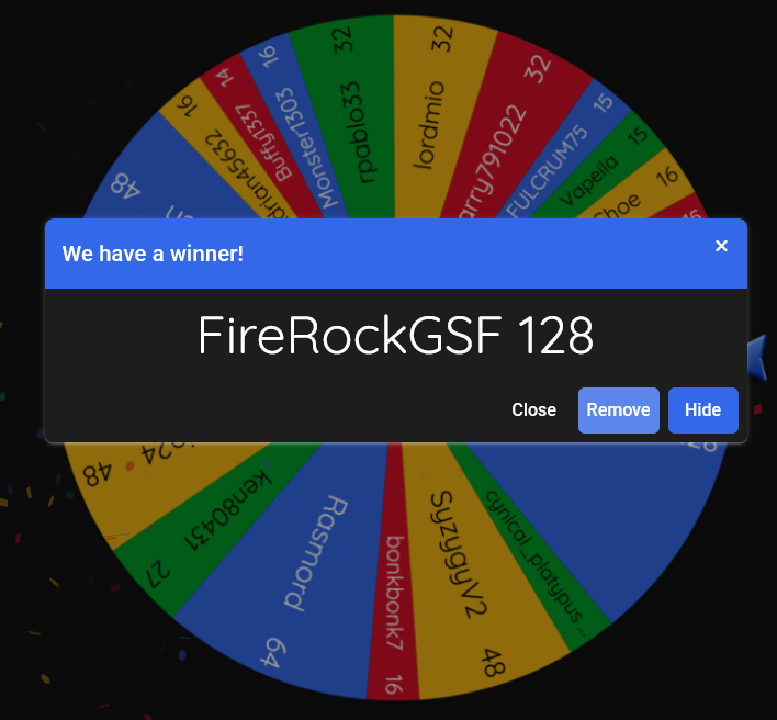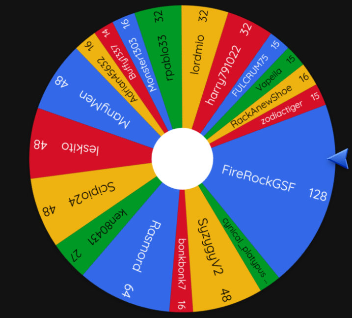The winner of the fifty-third round iiiiiis.... @FireRockGSF, who had a 19.84% chance to win! (out of 19 participants)