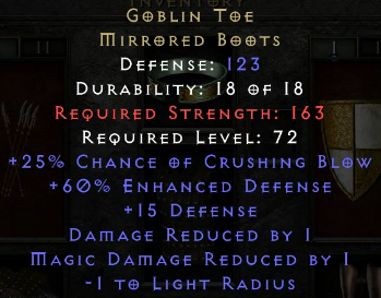 Here is a perf exceptional Goblin Toe (using it on my smiter):ShadowHeart wrote: 4 months agoNow up it to exceptional and see if it rolls perfect defense. And then, if it doesn’t, up once more to elite for a second chance at perfect defense.gensymmed wrote: 4 months agoBoth of these nice lower-level perfects dropped today. Stormguild and Goblin Toe.