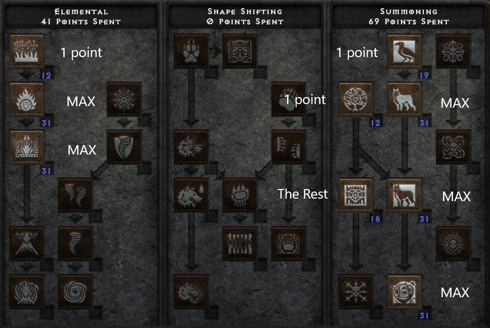 2) since you're having your zoo as the meat shield and are acting from the back with your throwing weapons, maybe spec to a different elemental skill? Firestorm works best at close range. Maybe just the Molten Boulder? That would make the shield slot available for sth else maybe, too.