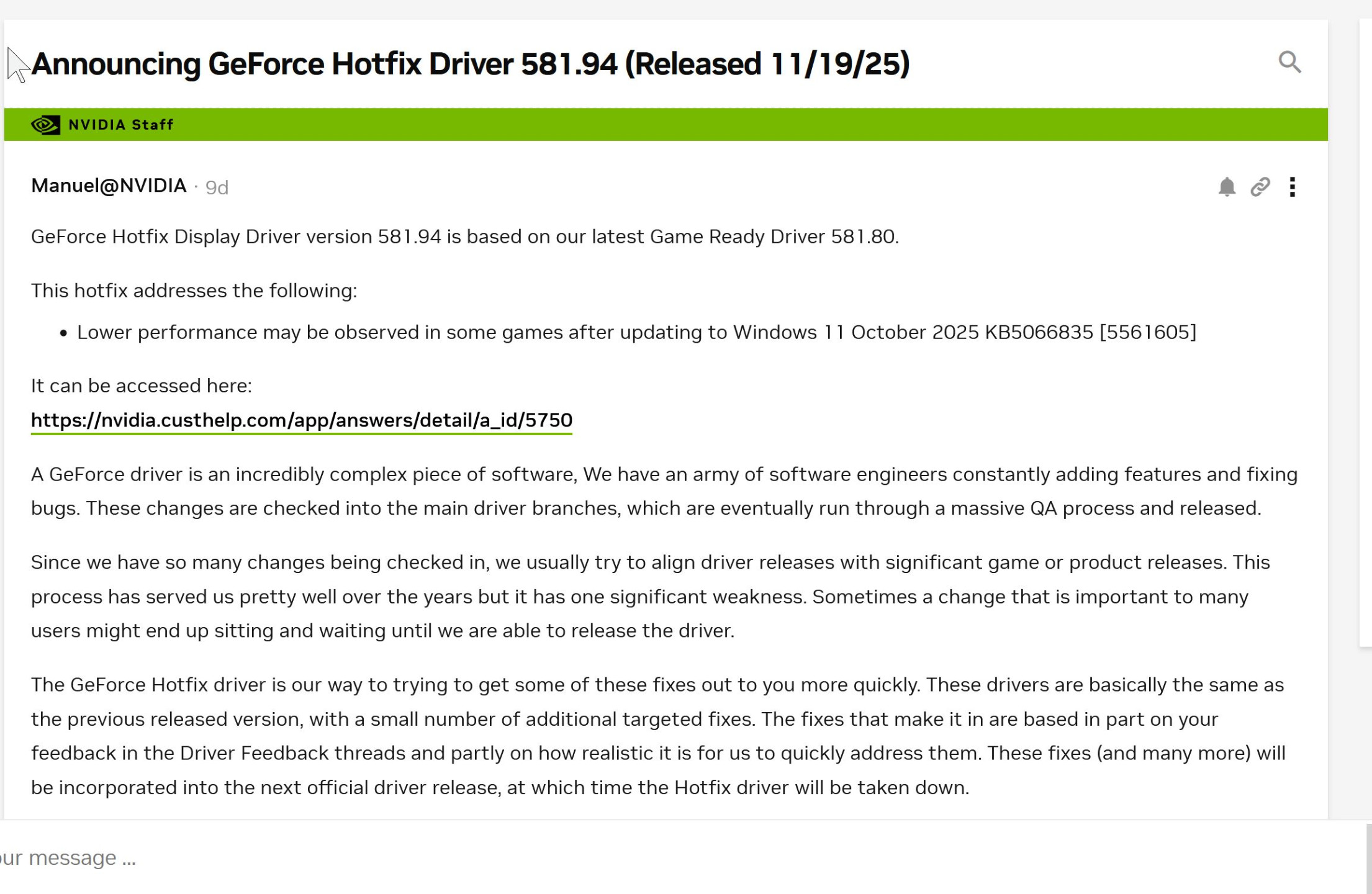 This seems like two completely separate issues, and it’s great if Nvidia has patched a performance issue that has arisen with a Windows patch, but until I hear otherwise the original 24H2 freeze issue is still unpatched. (I know many people with this particular issue)