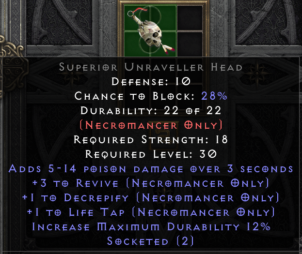 Thank you @atari. When I saw Revive + Decrepify + Life Tap (all very useful skills), I thought it had some value.atari wrote: 2 months agoI would say no value. IMHO Homunculus is a lot better and cheap. There are also other cheap options like Trang-Oul's Wing to get -25% enemy psn res for Poison Nova Necromancer or Darkforce Spawn with +3 to poison and bone skills.