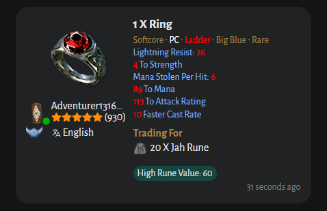 I just don't see Charsi handing over 20 Jah for it. In my view it's a hodgepodge of attributes. For instance, a strafezon can benefit from the AR, lighting resist, and the 6% mana leech, but the rest is not all that useful. The ring as a package in my view isn't that special for any particular build and that reduces its value.