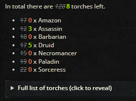 - Sorceress: 35 people had Sorceress as their first choice, and since there are only 18 Sorceress torches, I used a random draw to pick 18 people. Here are the lucky Sorceress torch winners: