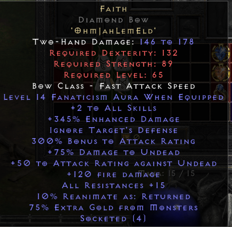 Faith Diamond Bow. Superior 15% ed, lvl 14 fanat, +2 skills. Looking for rune offers.