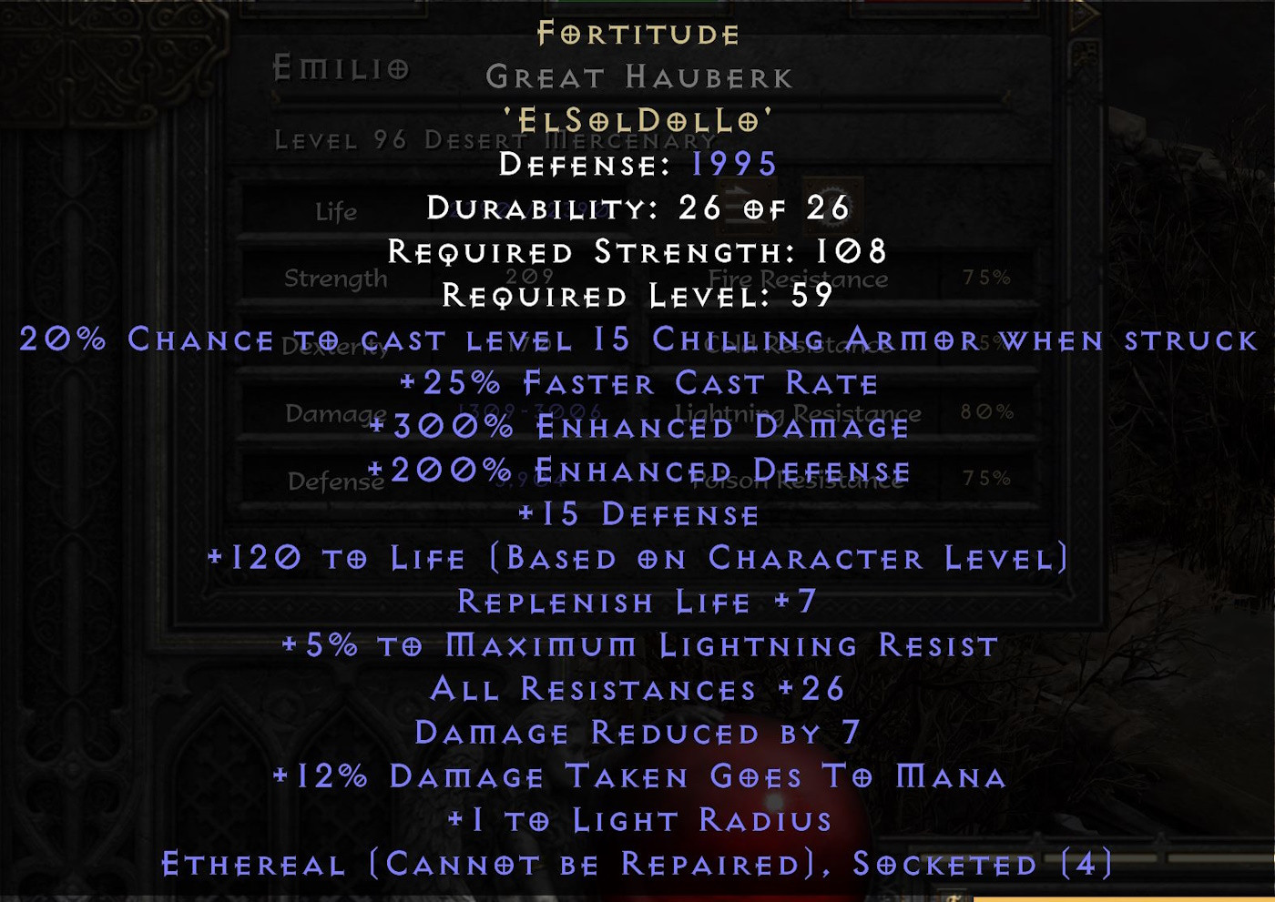 For merc you should use Eth and the requirements for Eth are lower, namely 10 less str. So for Eth SA it's 222 str.mhlg wrote: 1 day agoAntheris wrote: 1 day agoMy impression is that while you could make an argument for the Hauberk actually being a better choice in game given the lighter armour class and lower strength requirement on very close defense numbers a Sacred Armor base would be a better resell value if for whatever reason you wanted to flip it down the road, a lot more players will see the Hauberk base and think "but that's not the best one" by default which seems at least worth considering when you're looking at sinking high runes into it. Idk, I probably don't have enough experience with this to be giving advice tbhVonnie42 wrote: 1 day agoHi,