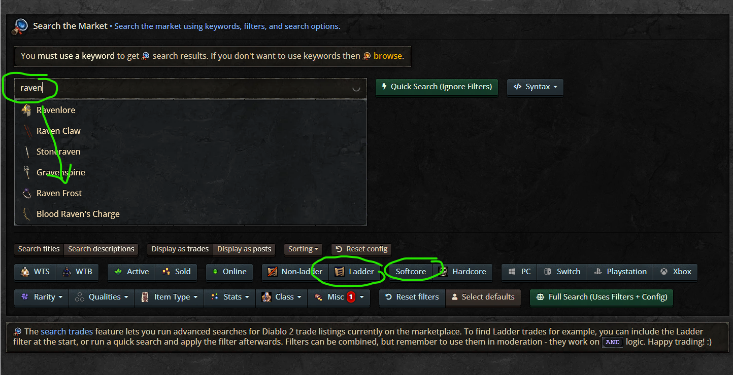 There you type the item name and select some filters matching your needs. In your case probably non-ladder and softcore?: I might also have a Ravenfrost in my stash, I can check this evening and let you know via PM.