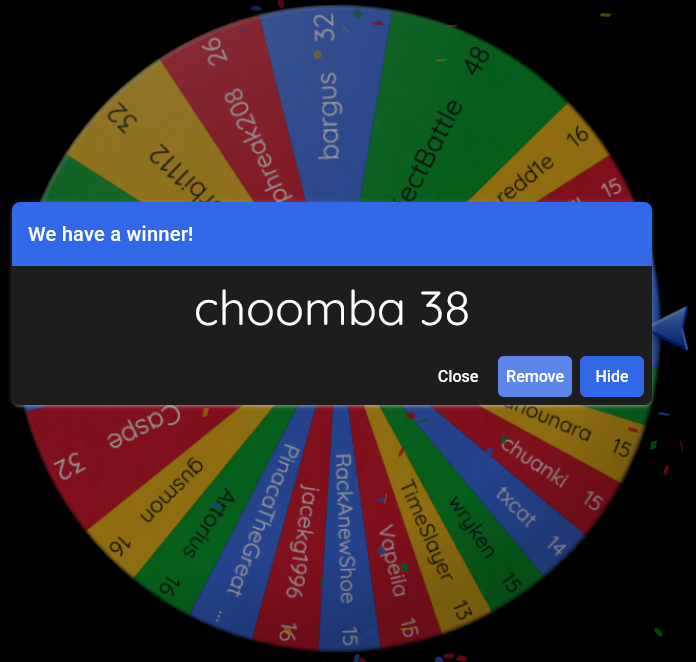 The first winner of the eighty-first round iiiiiis.... @choomba, who had a 7.87% chance to win! (out of 22 participants)