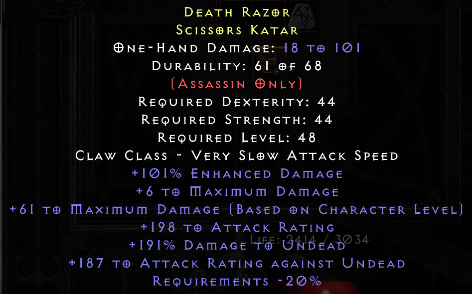 Your Katar only has the Grinding prefix (+0.75 per Character Level to Maximum Damage) and Master's prefix (+151-250 to Attack Rating and 101-150% Enhanced Damage). Everything else rolled too low or isn't useful at all. That's only 2/6 affixes and it's not ethereal.