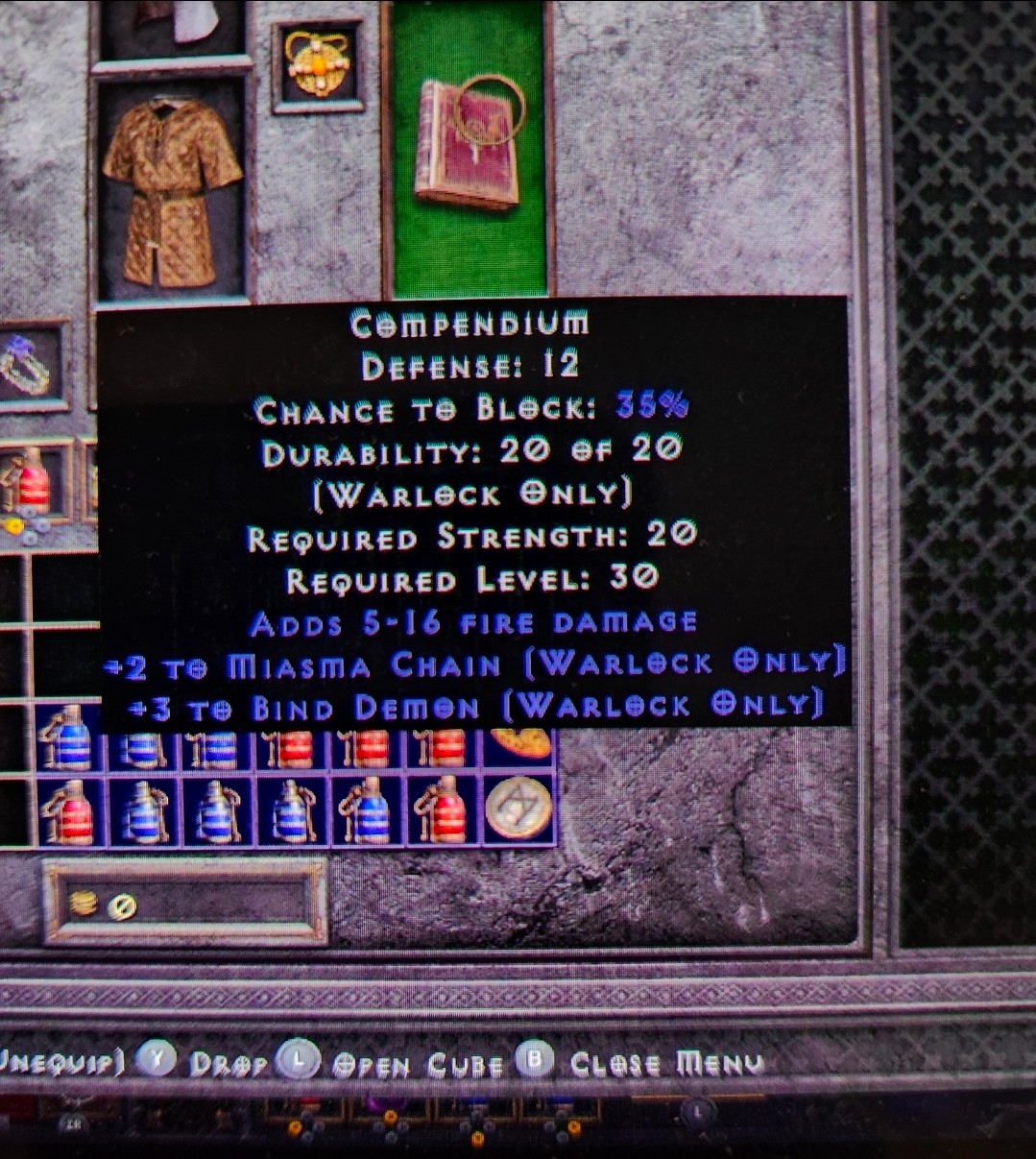 White Compendium +3 Bind Demon +2 Miasma Chain. Can socket for rune words. Saves 9 hard skill points for a Miasma Warlock to get Bind Demon. Obviously no history yet for these skills, but this seems big, ya?