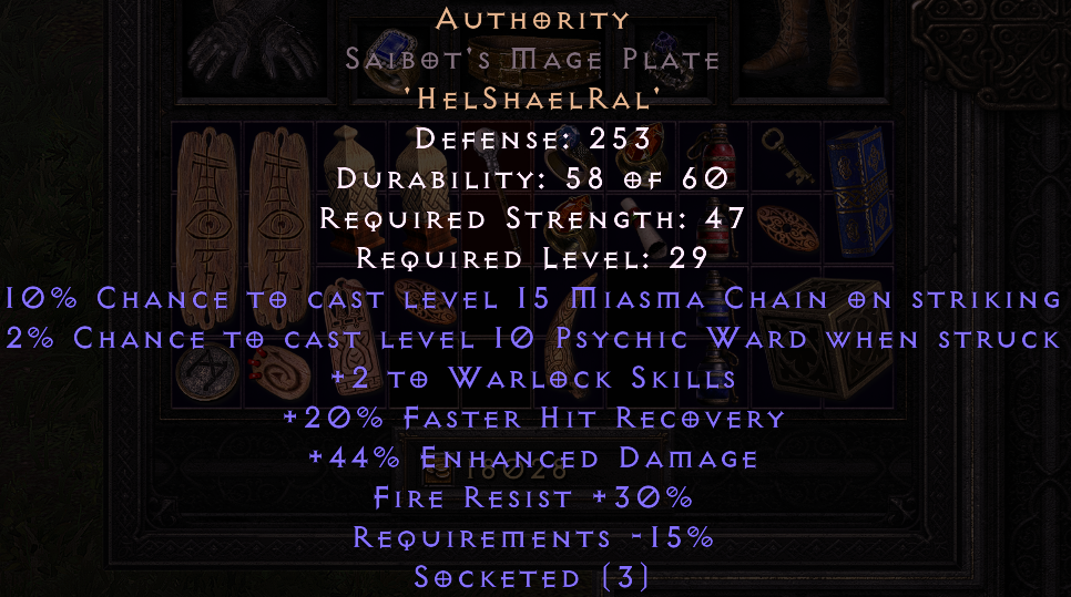 Given its common rune ingredients and low level requirement, this is a popular early game runeword for all Warlocks, specifically for the +2 to Warlock Skill Levels modifier.