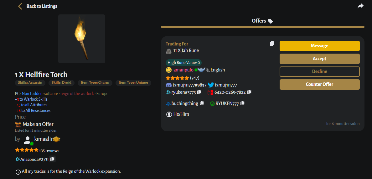 Warlock. 15 Attr. 18 All res. LF offers