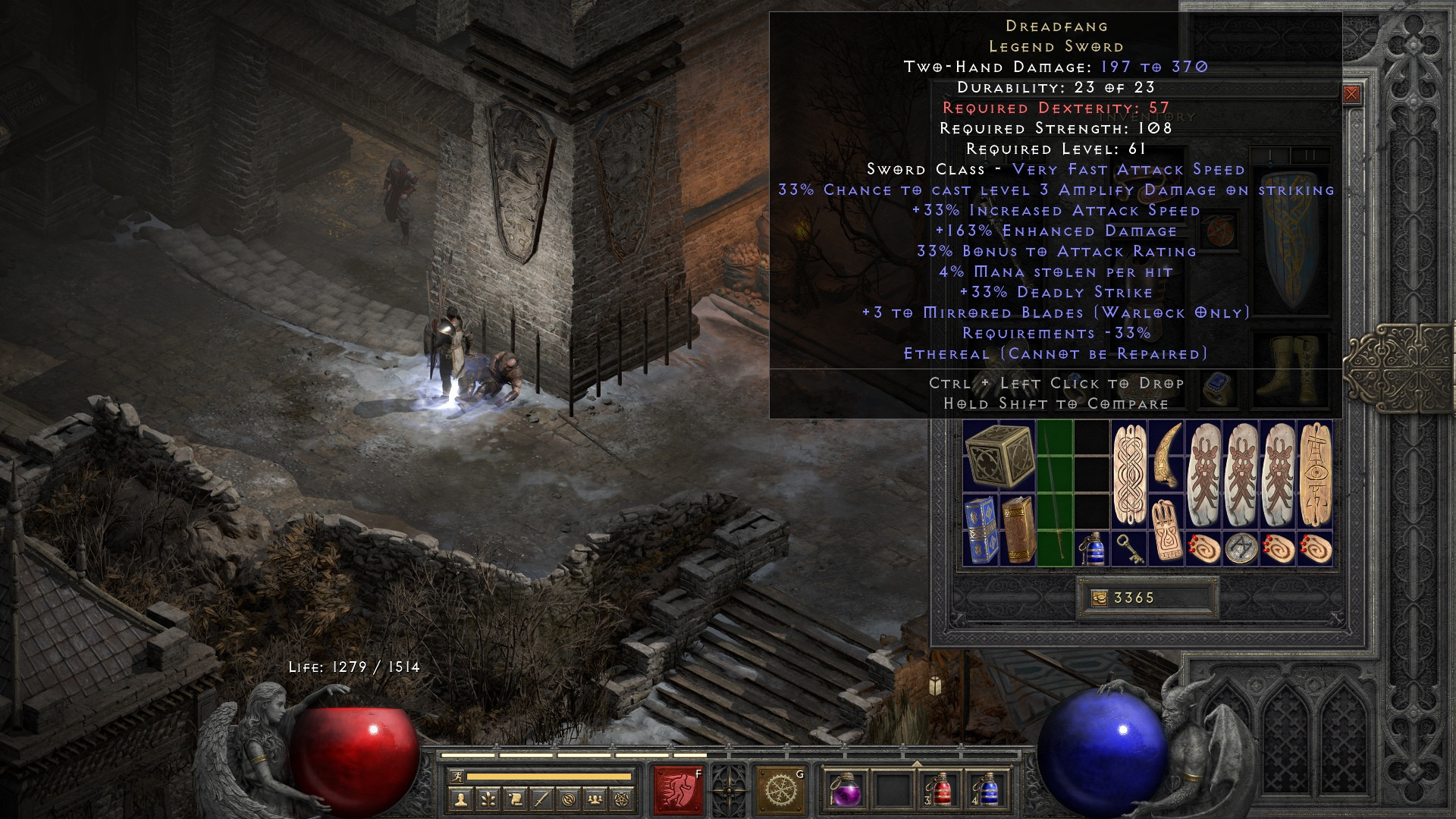 This is a *NEAR PERFECT* Ethereal Dreadfang, 166% ED is perfect, this item is 163% ED. Just found this today 2/28/2026 in the Worldstone Keep Level 2 in a Terror zone off a mob boss pack.