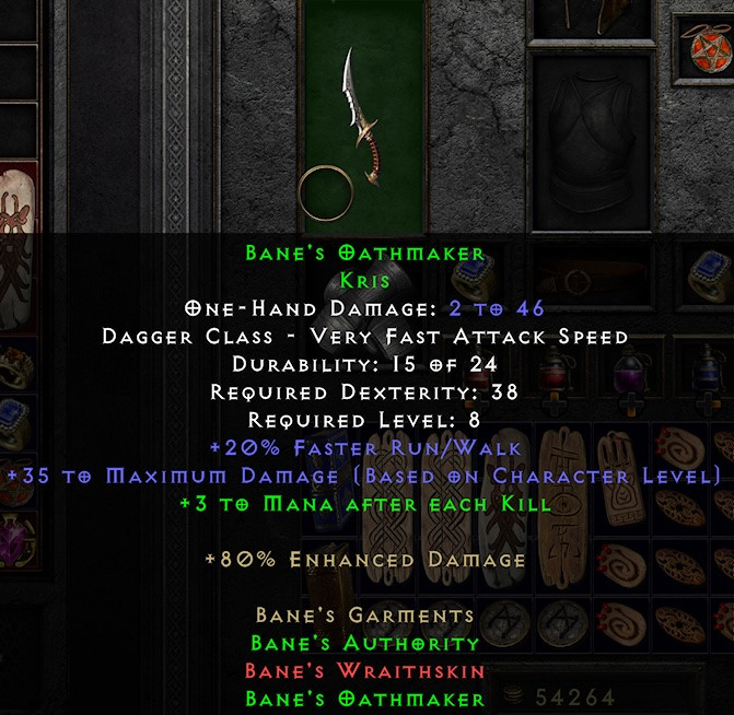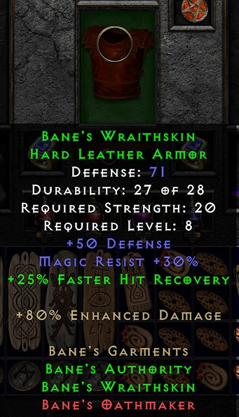 Bane's Garments partial set bonuses are incorrect. Full set tooltip states that the partial set bonus for weap and armor will vary depending on which other piece is set. However the weapon will always have +3 MAEK as a partial bonus regardless if its the Belt or armor equipped. When equipping the armor the partial set bonus will always be 25%FHR regardless of its the Belt or weap attached.
