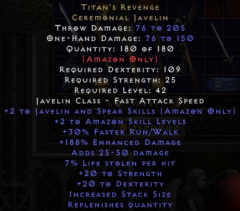 Hello. Saw your trade at https://diablo2.io/trade/titan-s-revenge-t1725247.html. Is this still available?