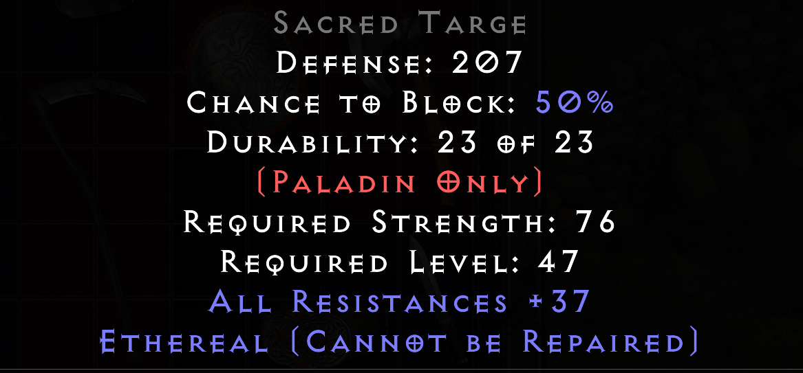Ethereal Sacred Targe - All Resistances +37, Chance to Block: 50%, Defense: 207, Durability: 23/23, Paladin Only, Required Strength: 76, Required Level: 47. Ethereal (Cannot be Repaired). LF offers / Pgems / Runes. PC / SC / Ladder / RotW