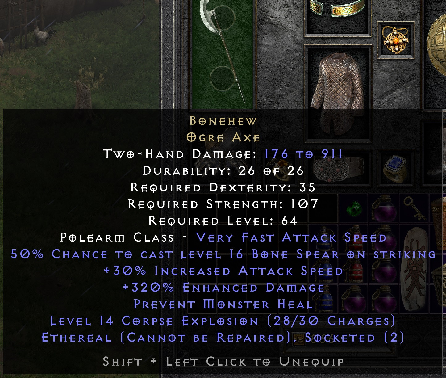 Well, I'm still having some fun with this new class, and earlier today I got a drop that sealed the deal for my ES build to finish Hell: In Act 2 I found a perfect ED, ethereal Bonehew! My max damage jumped frighteningly high when I equipped it, and now combined with amp damage from my bound demon, I'm afraid this is truly a broken run. Hell's Mephisto and Diablo couldn't even hold a candle to normal's Corpsefire.