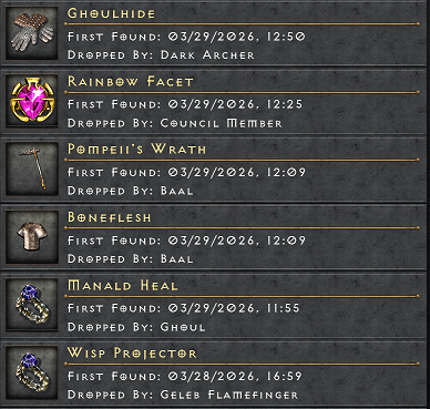 , Trang's Armor, IK Armor, Spirit Shroud, Eye of Etlich and (3) skill charms; def aura, traps +34 life and demon skills. As well as some missing pieces to low level sets.