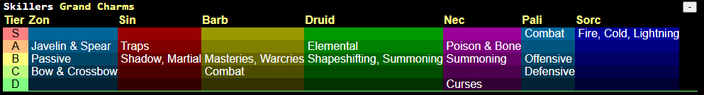 Yup. There are great ones out there, but like you said it's relegated to melee which isn't exactly a popular route these days. I refer to this chart on skiller viability:mikelessar wrote: 1 hour agoLarge charms can be pretty strong for melee chars not needing +skills (max damage + attack rating + life) On ladder, I pick up all large charms and last season I got lucky and sold a strong melee lc for almost 2 Jah