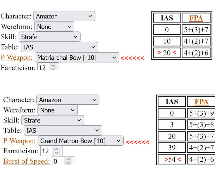 No, you'll have a a 1 frame attack difference. If using a standard skill for amazon you'll hit 8FPA with your 35IAS, lvl 12 Fanaticism, and a Matriarchal Bow and 9FPA with a GMB.