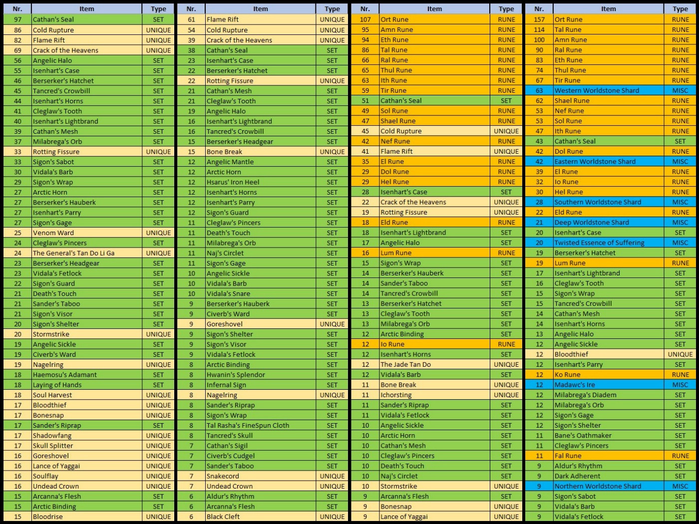 This really makes me wish I'd kept track of all my drops too. Isenhart's is probably my most common drop but it's funny that Atma's Scarab & Highlord's Wrath are half (if not more) of the unique amulets in my collection.