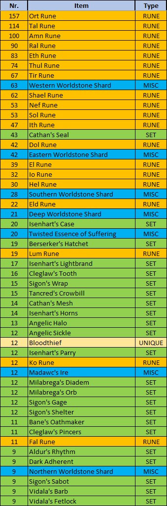 Runes - 30 items - (1134 total with doubles) - The most found: Ort 157 times.
