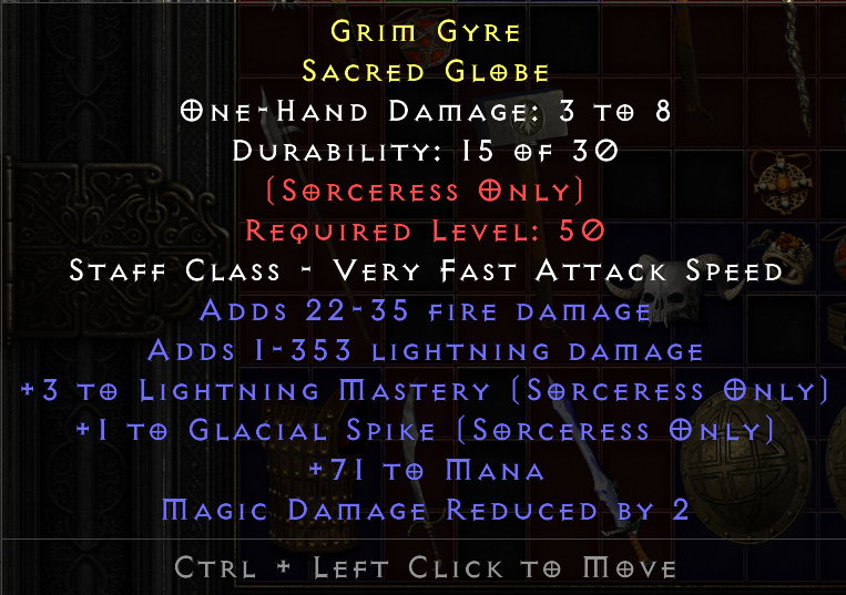For a good one, you would want stats like +2 sorc (all) skills, + top end skills (blizz, lightning, fb, fw, orb, etc), faster cast rate, and other top tier specs.