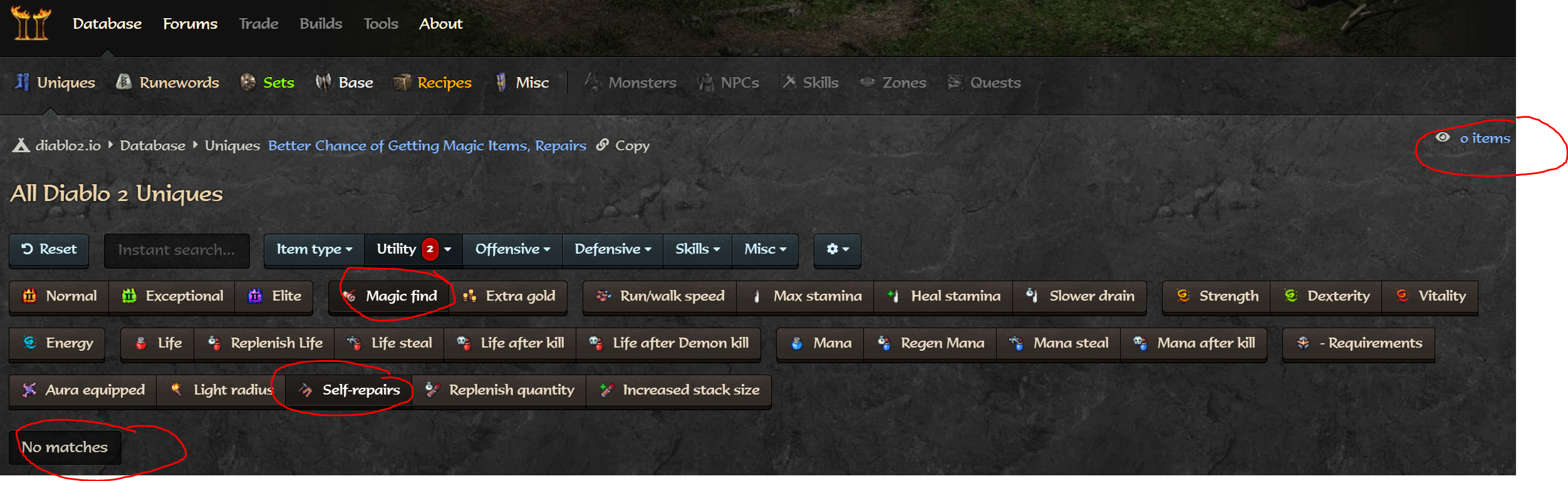 Hi there, when I filter by Magic Find and Self Repair in Unique Items,