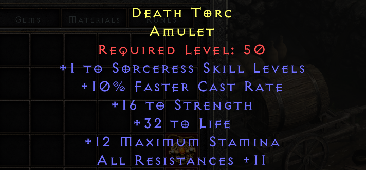 Sorc amu : a nice temp but not 2 to skills hurts a lot to have significant value. I'd actually keep that one to level up ay char.