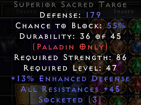 I got a 3os Sacred Targe with 45 Allres and 13 enhanced defense (Ladder Softcore).